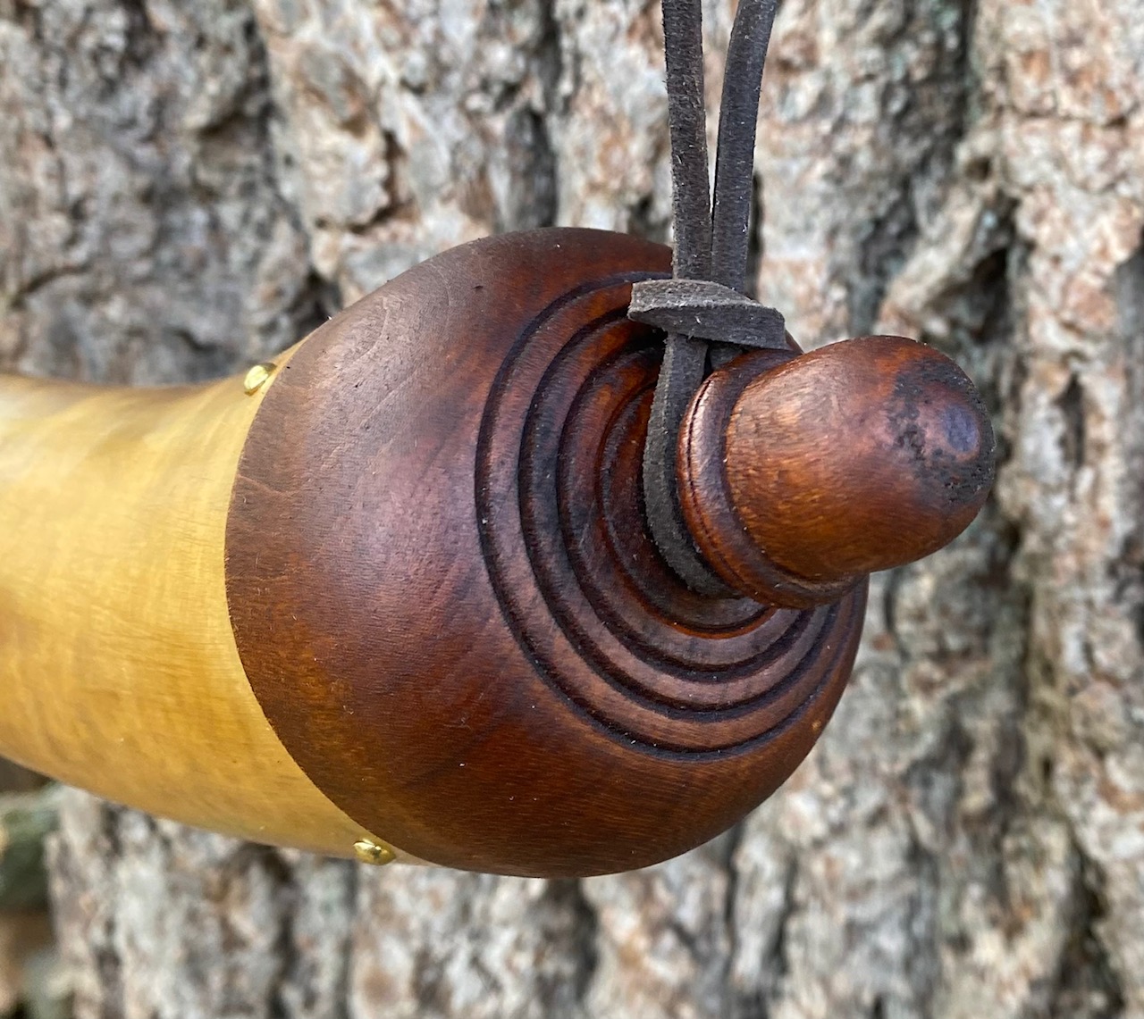 The Deluxe Large is a great hunting or range horn for living history, re-enacting or hanging on the wall. The acorn finial is a symbol of luck back in the day and is a very functional and secure integrated finial. The tip features three decorative grooves, a band, and a strap groove. Out of that, a series of contoured flats arise. The base plug includes a banded acorn, 3-4 decorative grooves. The standard finish is antiqued.