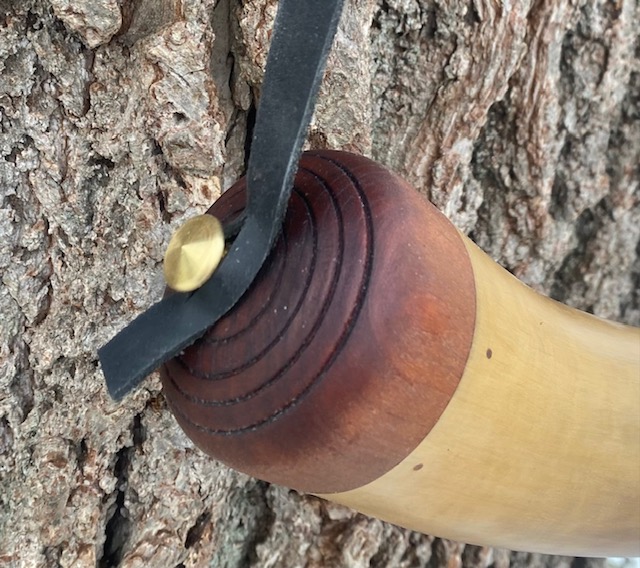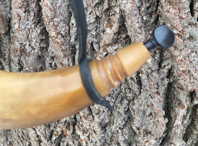 Instead of lathe turning a wooden finial onto the base-plug, we mount a Small Brass Finial instead. This allows the ability to pour powder into a somewhat larger opening, instead of the 5/16″ spout hole. Also, instead of using solid brass nails around the base, we space 8 little 1/16″ hardwood pegs around it. The horn comes complete with a narrow lace carry strap and an ebony violin peg stopper.