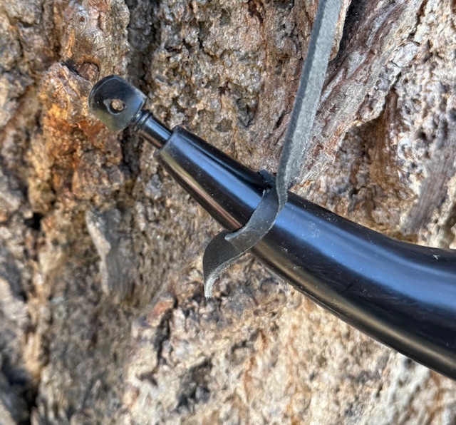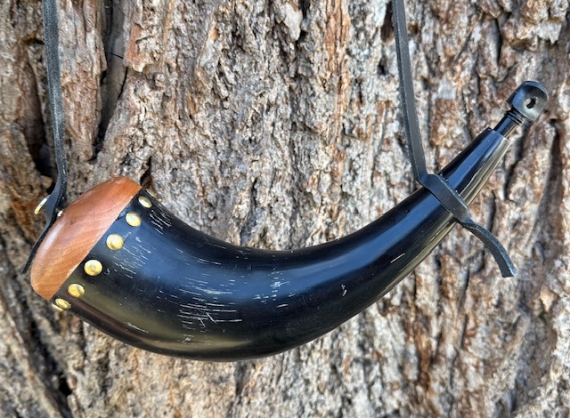 This powder horn was designed specifically for the fur trapper era. It is a polished American Bison horn just like the originals and comes with a simple base of cherry, walnut or even pine. (If you want a specific wood species, put it in the order notes.) The base is held in with low dome brass tacks and has a brass drawer pull for the finial. The plug is an ebony fiddle peg squared off with a hole for a small lanyard so you don’t lose it in the woods. The Mountain Men were lower class working men and if they lost their horn the company might provide one such as this or they could have traded with the local Native Americans for it or made one themselves.