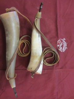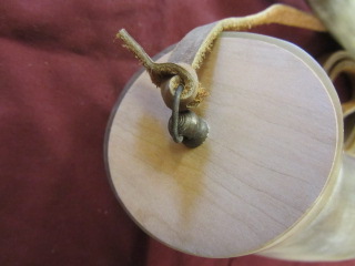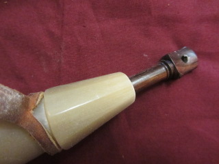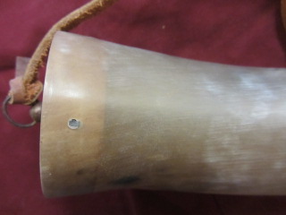 This powderhorn was designed after a known surviving horn. I have included pictures of the original horn. This horn will have a gentle double twist, 3/4 to 1 inch of HAND FILED flats at the tip, an aged finial with ring and a 3/8 inch strap attached to it. The fiddle peg will be hand carved down to look like the original in the picture. The base plug on these are cherry but will vary from cherry to walnut or oak, depending on what I have in stock. The base plug is attached with hand cut finish nails like the original pictured and many other originals. If you want a specific type of wood put it in the order “notes section” and I will do my best to accommodate. It might delay building it to get the wood you want.
