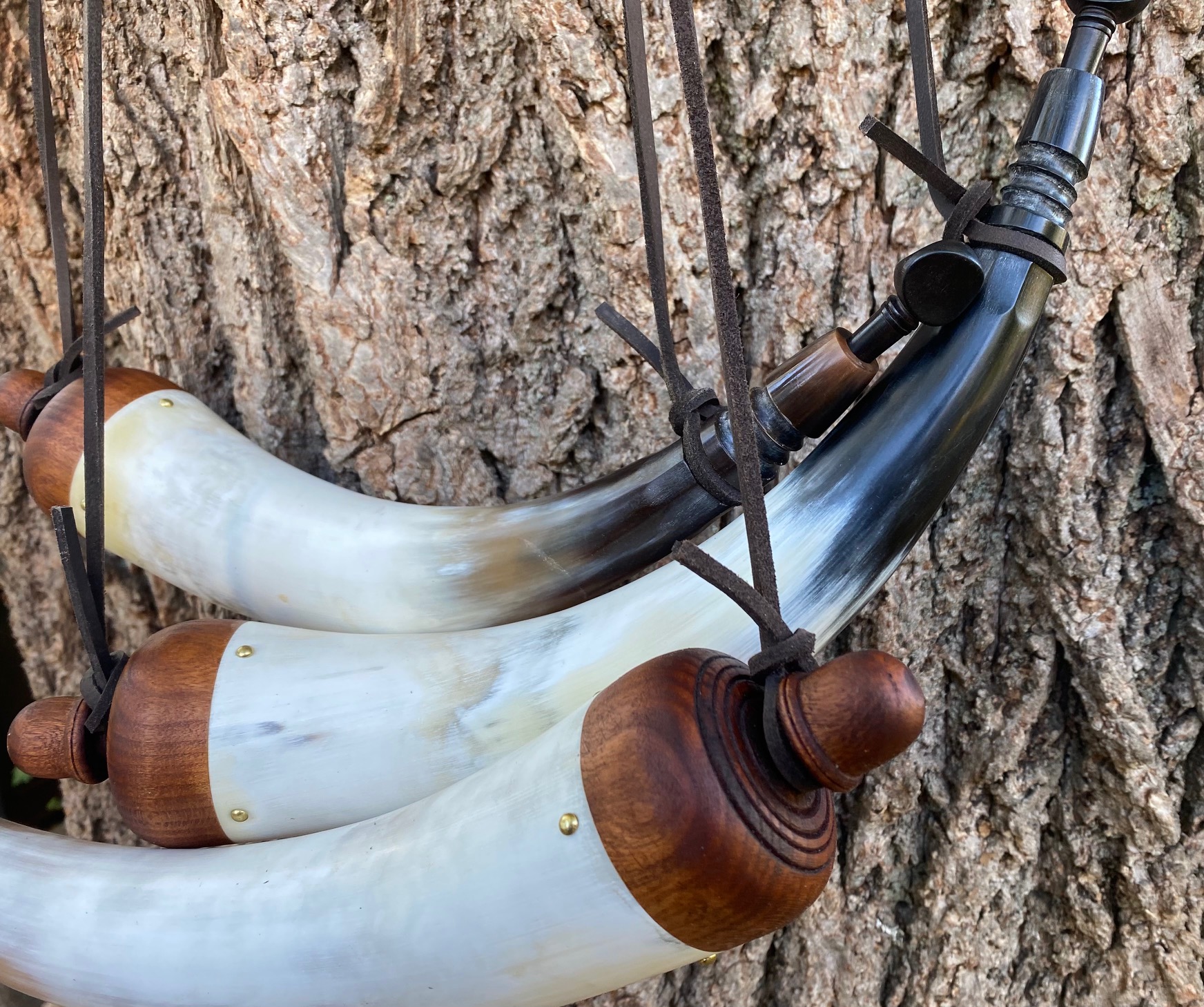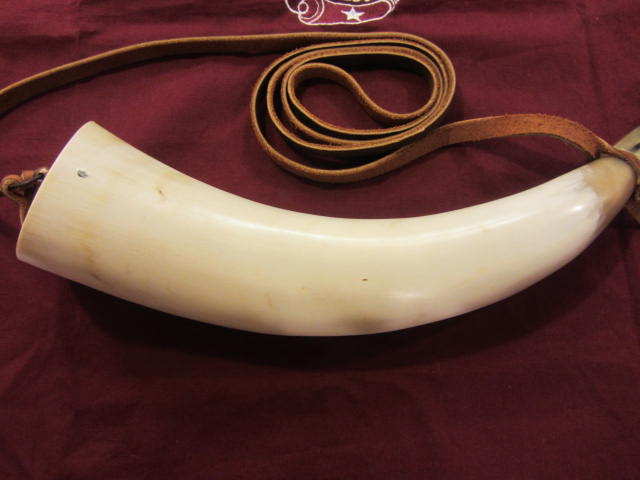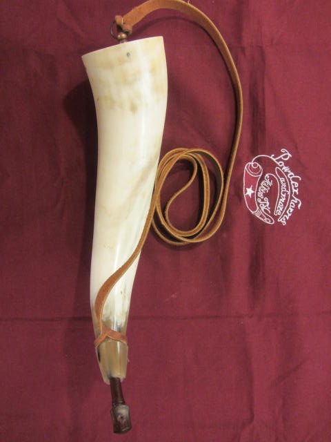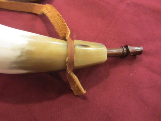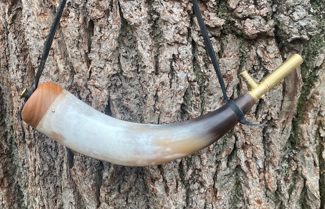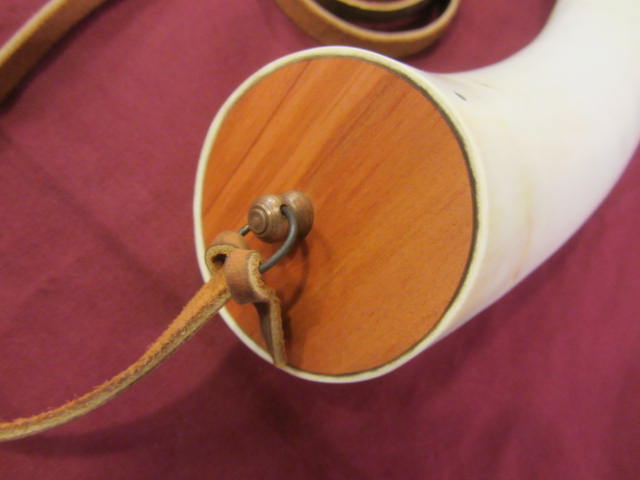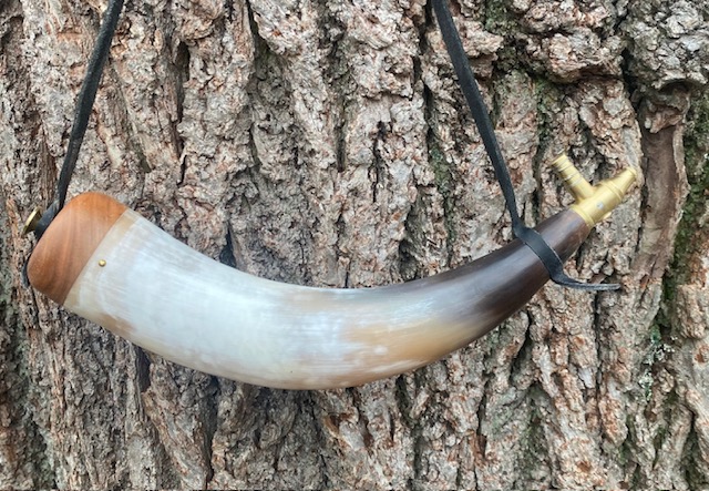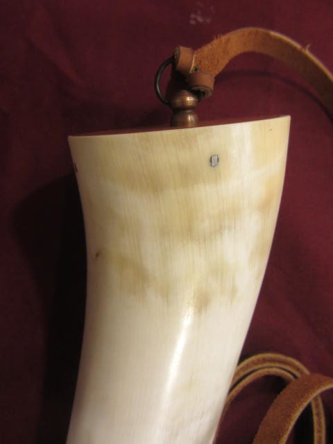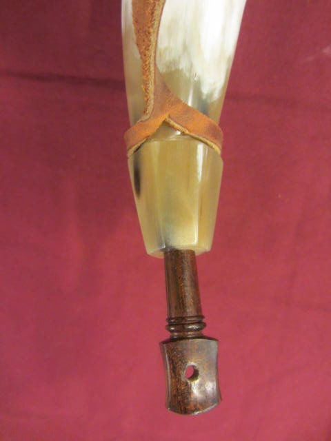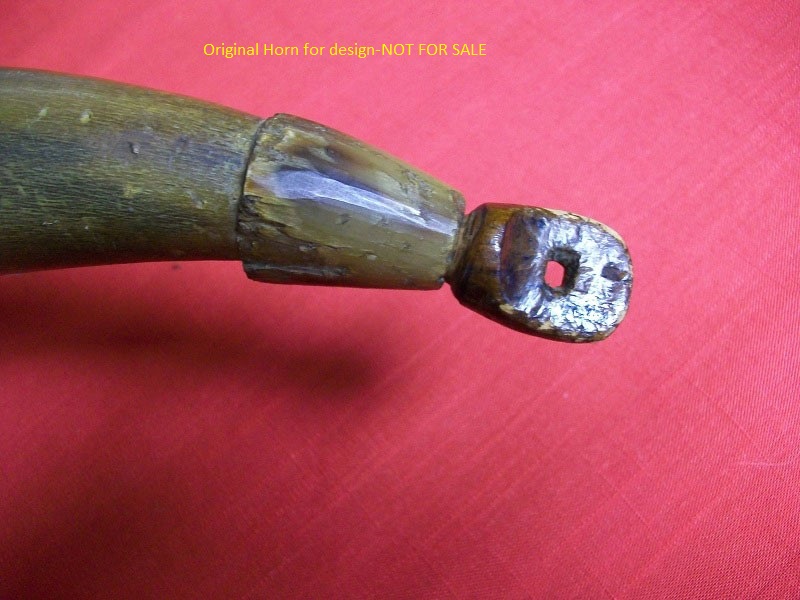 This powderhorn was designed after a known surviving horn. I have included pictures of the original horn. This horn will have a gentle double twist, 3/4 to 1 inch of HAND FILED flats at the tip, an aged finial with ring and a 3/8 inch strap attached to it. The fiddle peg will be hand carved down to look like the original in the picture. The base plug on these are cherry but will vary from cherry to walnut or oak, depending on what I have in stock. The base plug is attached with hand cut finish nails like the original pictured and many other originals. If you want a specific type of wood put it in the order “notes section” and I will do my best to accommodate. It might delay building it to get the wood you want.