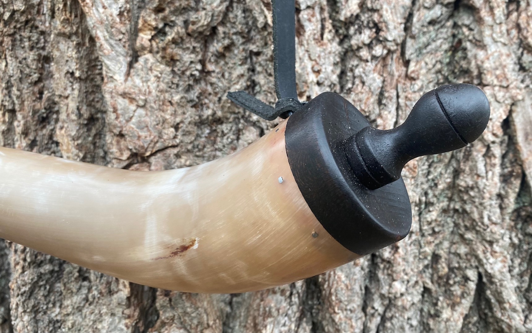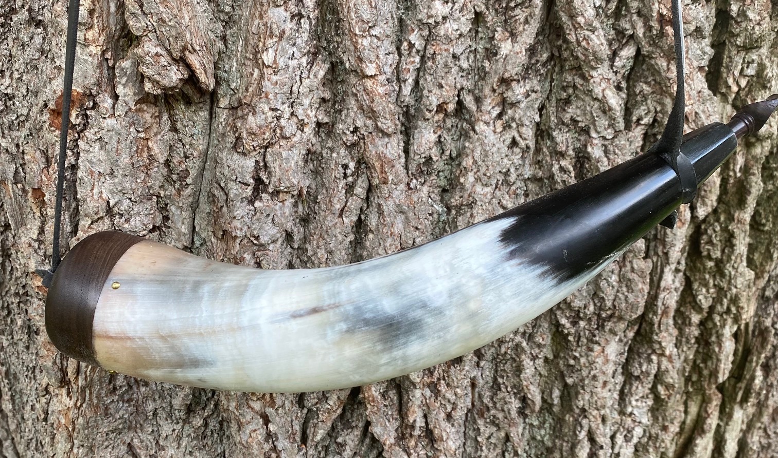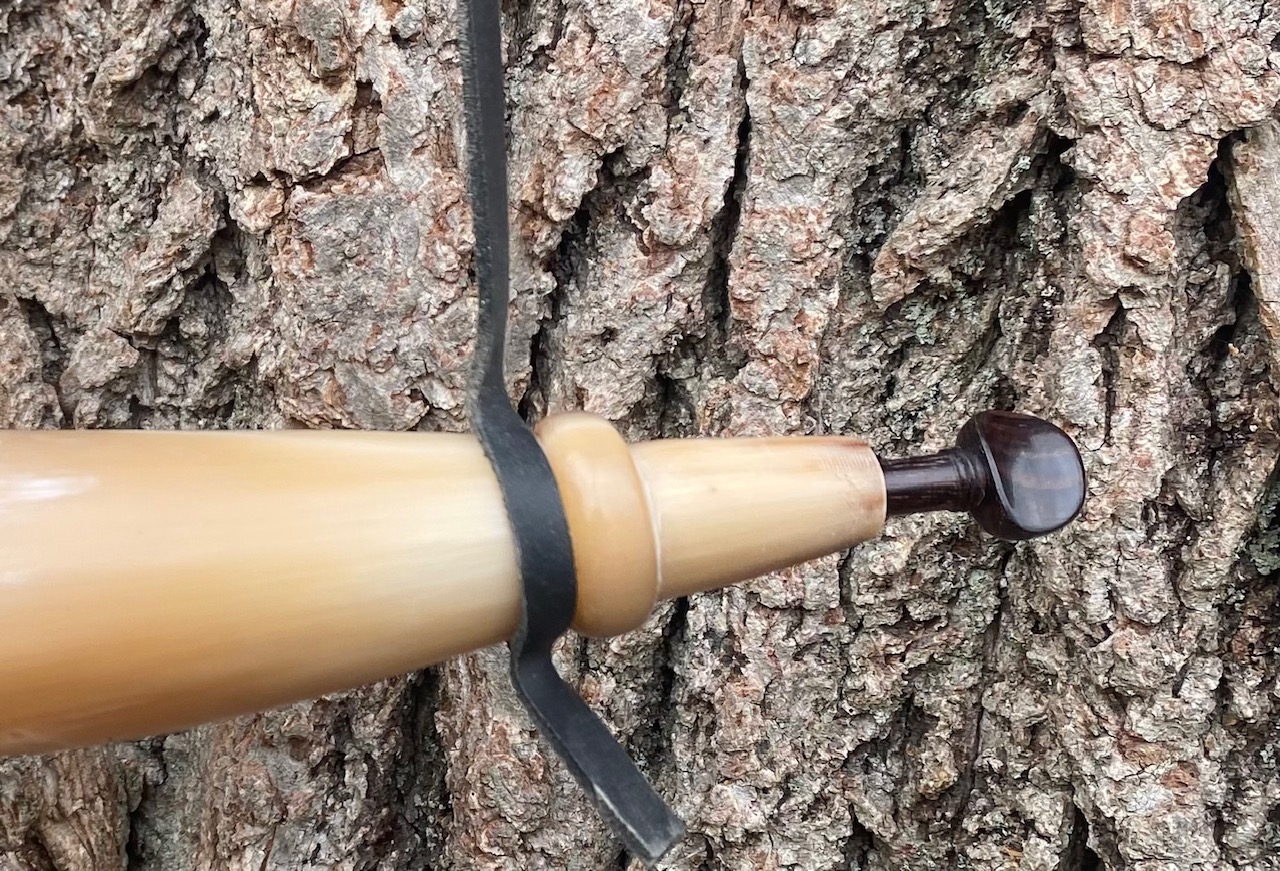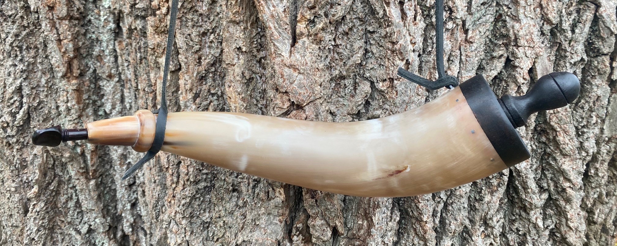 This is a copy of a surviving military horn that would have been made according to government specifications. Mine is as close to the originals as I can make, but each one I make gets better! The base is Cherry with a threaded finial to fill from the bottom. The base plug is held in place with square cut nails like the originals. It comes with a fiddle peg stopper made of rosewood and included is a 3/8 wide strap, not pictured. There is a staple in the top of the plug just like the original. I do not recommend attaching your strap to the threaded finial.