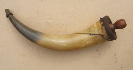 A GOOD AMERICAN REVOLUTIONARY WAR PERIOD MUSKET-SIZE POWDER HORN, ca. 1770: In overall Good+ condition with toned and smooth, naturally curved, cow horn surfaces and its original concave hardwood base-plug with a finely turned, removable, screw-type, wooden end-plug. The large sized and curved approx. 18″ cow horn body with an integrally turned and chip-carved pouring spout with straw/brown toned patina, an old tight hairline, at its base and some patches of gunpowder-staining. Concave hardwood base with an untouched dark age-patina and its original finely turned end-plug with a screw-type attachment and a bulbous knob— a side-mounted iron staple for the attachment of a suspension-cord. Very good base with some minor abrasions, untouched wooden surfaces and expected light handling marks. The body of the horn with smooth, richly toned and lightly oxidized natural cow horn surfaces and the noted tight age-crack/hairline. The base fastened with its original, square-cut, iron nails/tacks with some expected light staining. A nice example of an original American Revolutionary War Period Powder Horn with a nicely turned base-plug-end and untouched surfaces, ca. 1770. For similar examples please see “The Collector’s Illustrated Encyclopedia of the American Revolution”.