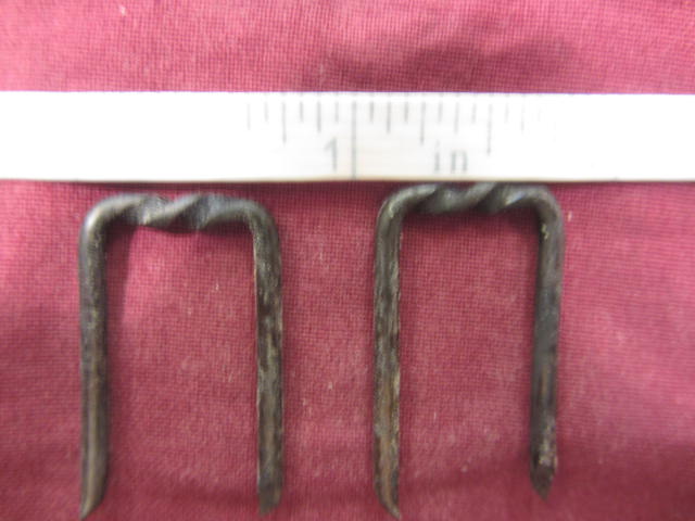 I make these staples in-house and are my own design. I have added a twist to the center and have blackened them with a method I learned from a professional blacksmith and knife maker. The legs are 1 1/4 inches long so that you can use them as they are or trim them off as required, giving you an option.