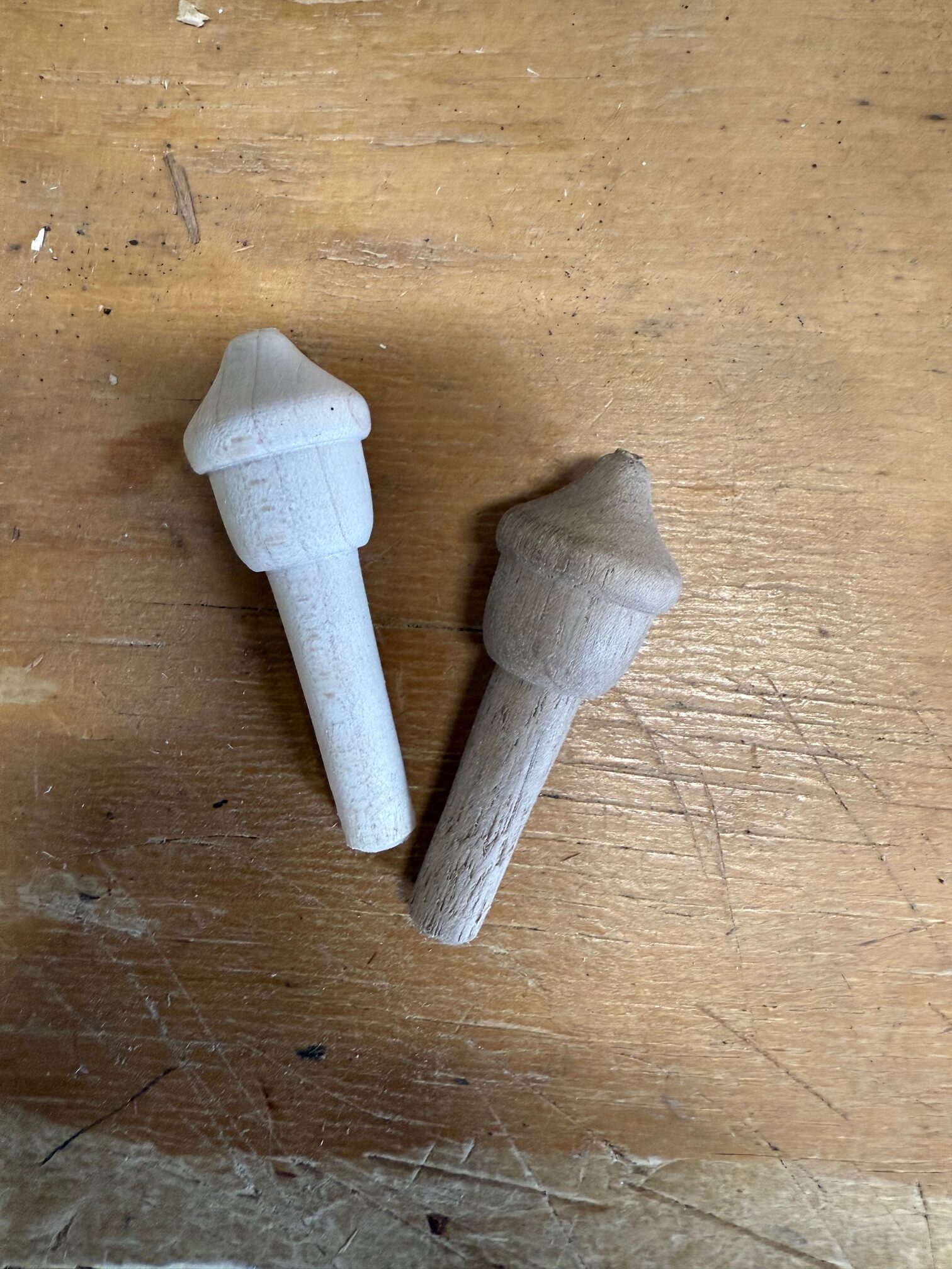 This a new peg I turn here in the shop and is not a totally finished product. You will need to do the final sanding and any chip carving you might want to do. This design, called my Acorn Peg is one that I will try to keep in stock as well. They are made of Hard Maple. The plug stem is 1.5 inches and the head about 3/4 of an inch for a total length of 2 1/4 inches. Because I hand urn them all without using a duplicator they will be roughly the same dimensions. The stem will need to be sanded or carved to fit your horn tip.