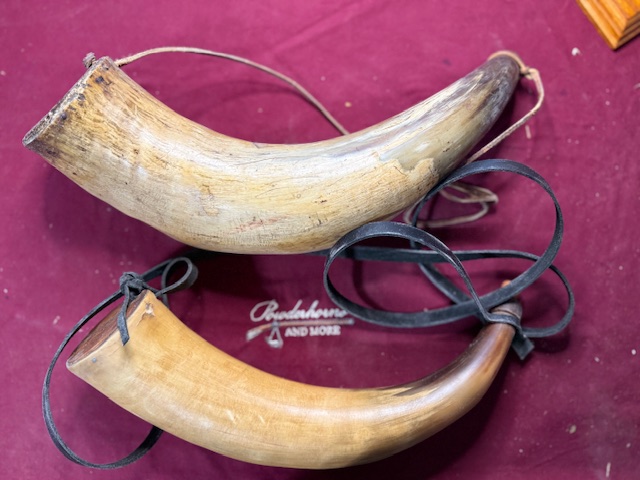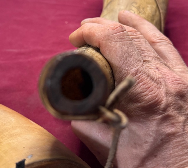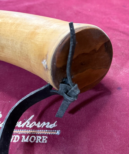 Since I do not have access to ox horns, I am reproducing it with cow horns. Mine is 16 inches long and 3 x 2 1/2 at the base, pine plug and a smaller hole in the tip with a hand turned plug.