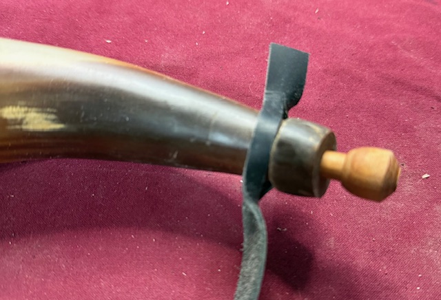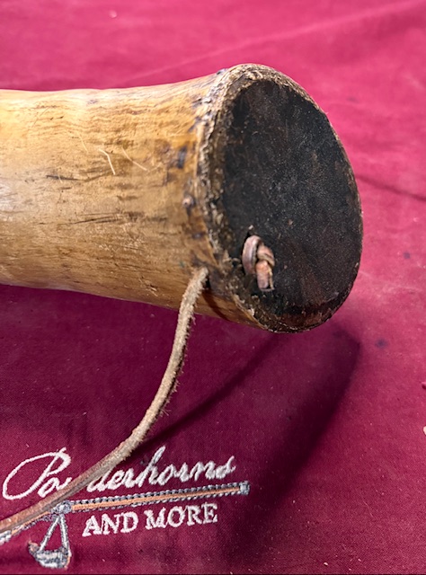 This horn was clearly made out of necessity and in a hurry with minimal tools. The tip was sawed off very close to the cavity so it has a 1/2 inch or better hole, simple wedding band on the tip to retain the strap and a pine plug.