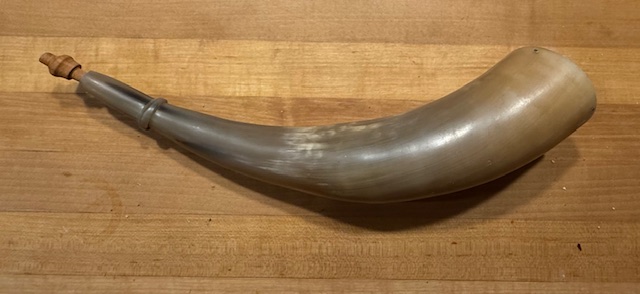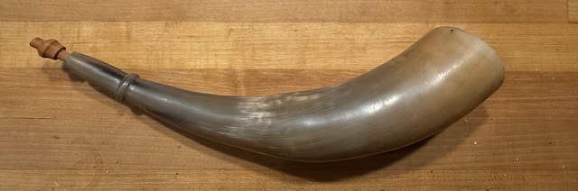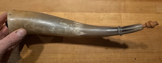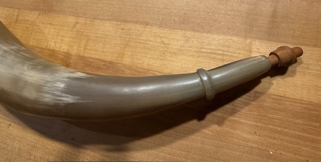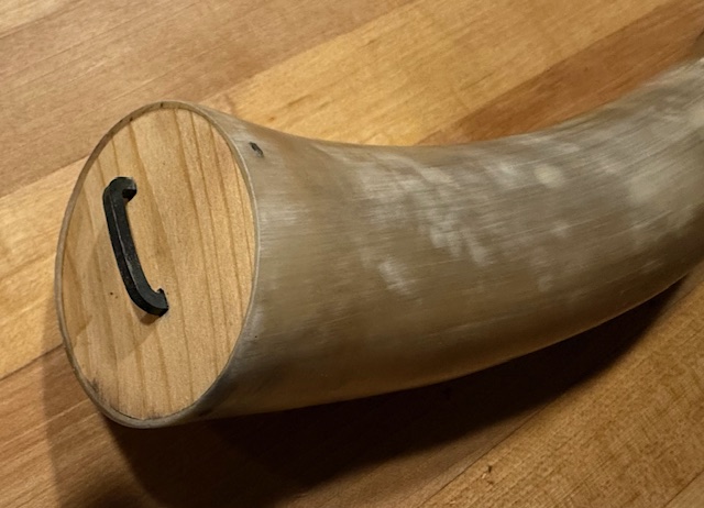 This is a horn I made based on an original. The only thing different is this has a staple in the base plug instead of a lobe. Pine base plug, like most originals, my own hand made one inch staple and custom stopper with a hole for a thing so you don’t lose it. Nice cream color like the original. Base plug held in with finish cut nails like the original as well.