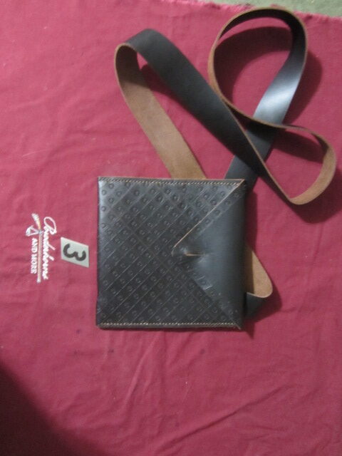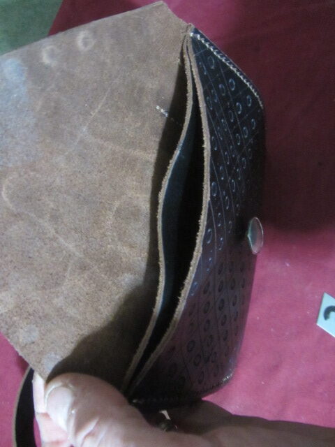 What a beautiful bag! 7 1/2 x 7 1/2 with two large inner pockets, pewter button closure. What a beautiful bag with great tooling on the outside. This is an eye catcher! Impressive work!