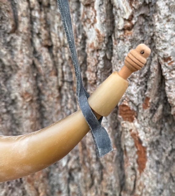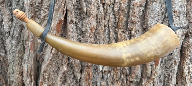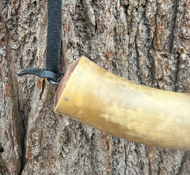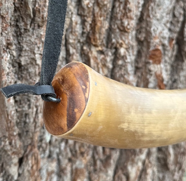 This is a great horn inspired by originals in every aspect of the design. Very sim please and common tip with an honey dipper plug with lanyard hole, simple pine base plug with a hand made staple of my own.